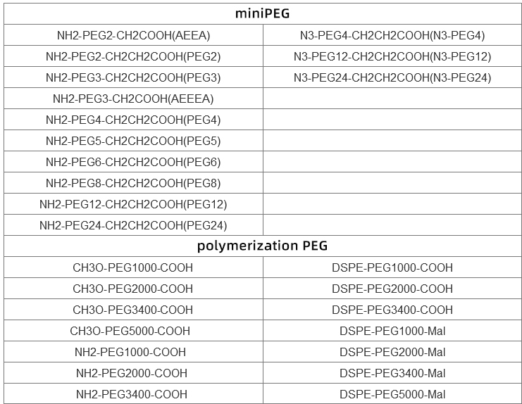 · Single functional group PEG: contains a chemically reactive terminal, which can be used for pePEG, nanomaterial modification and modification;