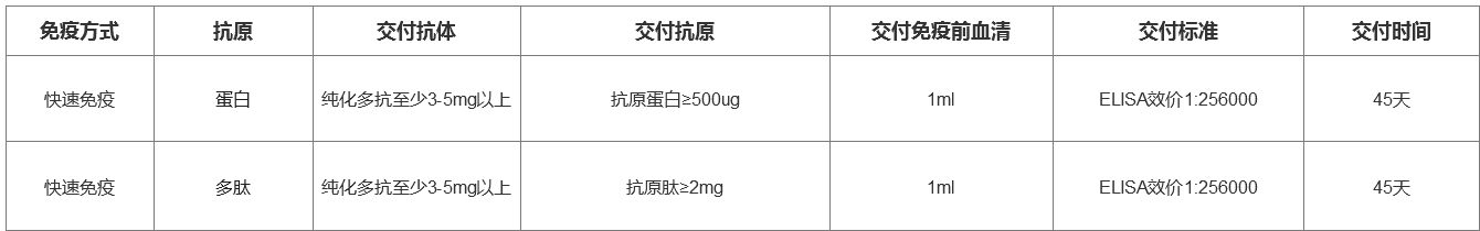 强耀生物综合抗原设计软件、自主研发佐剂和免疫设计方案,全新推出快速抗体制备服务。此服务可接受客户提供的抗原,也可以帮助客户合成抗原,45天完成多克隆抗体生产。还可以提供特殊套餐服务, ELISA效价高达1:256000。