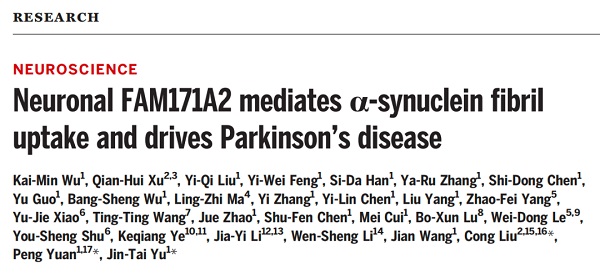 2025年2月20日,复旦大学附属华山医院郁金泰教授团队联合复旦大学脑科学转化研究院袁鹏教授及中国科学院上海有机化学研究所刘聪教授(博士后吴凯敏为第一作者),在国际顶尖学术期刊 Science 上发表了题为:Neuronal FAM171A2 mediates α-synuclein fibril uptake and drives Parkinson’s disease 的研究论文【2】。