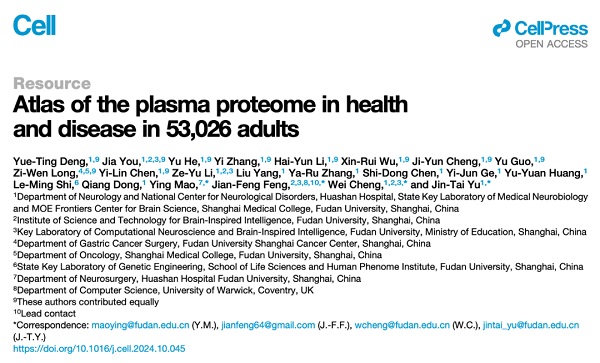 2024 年 11 月 22 日,复旦大学附属华山医院郁金泰、毛颖团队与复旦大学类脑智能科学与技术研究院程炜、冯建峰团队合作,在国际顶尖学术期刊 Cell 在线发表了题为:Atlas of the plasma proteome in health and disease in 53,026 adults 的研究论文【3】。