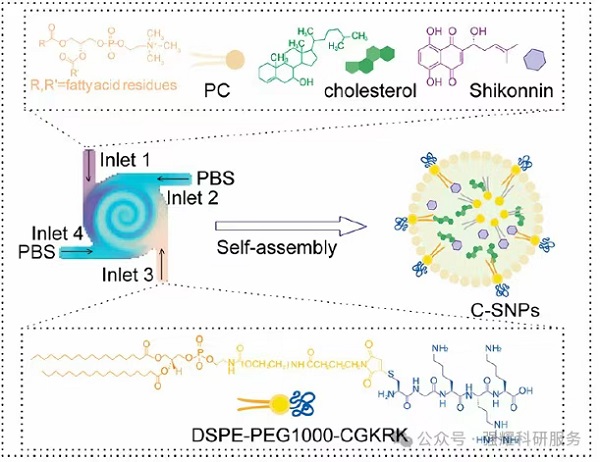 研究团队首先设计了一种脂质纳米颗粒C-SNPs。这种颗粒通过CGKRK肽修饰,能够特异性靶向高表达HSPG2的鳞状细胞癌细胞,并成功递送活性成分紫草素(SHK)。紫草素作为一种天然化合物,具有诱导免疫原性细胞死亡(ICD)的能力,但由于溶解性和脱靶效应的问题,其临床应用受到限制。C-SNPs的出现解决了这些问题,显著提高了紫草素的稳定性和靶向递送效率。