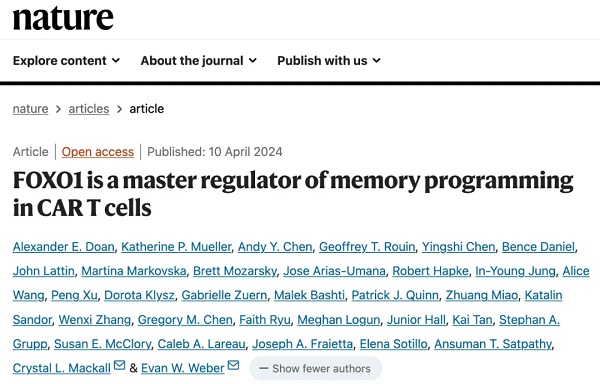 第一篇论文来自宾夕法尼亚大学和斯坦福大学的研究团队,论文题为:FOXO1 is a master regulator of memory programming in CAR T cells 。