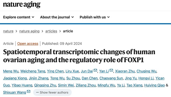值得一提的是,2024年4月9日,华中科技大学同济医学院附属同济医院王世宣教授团队等在 Nature Aging 期刊发表了题为:Spatiotemporal transcriptomic changes of human ovarian aging and the regulatory role of FOXP1 的研究论文。