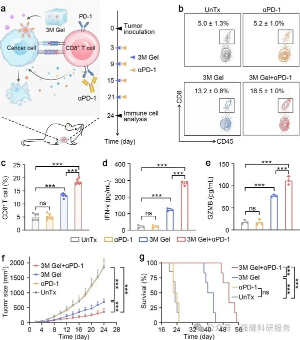 (1)单模型疗效(TNBC):3M Gel 使肿瘤体积减少 56.0%±5.7%,中位生存期从22 天延长至 43 天;肿瘤内 CD8⁺T 细胞浸润↑3.2 倍,DC 成熟标志物(CD80⁺CD86⁺)↑2.8 倍。