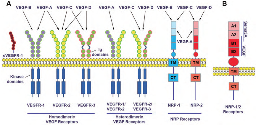 VEGFR通常由一个细胞外区域--具有七个免疫球蛋白样结构域,一个跨膜结构域,一个细胞内酪氨酸激酶结构域组成。主要分为3类:VEGFR1、VEGFR2、VEGFR3。VEGFR1和R2均在血管内皮细胞上发现并调节血管生成。VEGFR-3主要分布在淋巴内皮表面,调节淋巴管的生成。