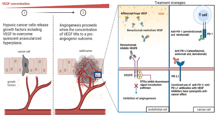 研究发现了VEGF抑制可增强化疗诱导的内皮细胞凋亡。VEGF/VEFR抑制剂与化疗的组合已经证明对多种实体瘤类型有明显的益处。此外,许多临床研究强调,接受单独抗VEGF/VEGFR治疗或与化疗联合治疗的患者,其肿瘤血液灌注或氧合增加,具有更好的临床结果。