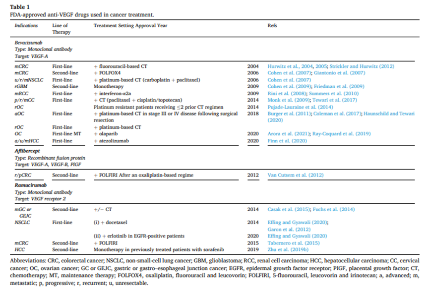 表1. FDA批准的用于癌症治疗的VEGF/VEGFR药物,doi: 10.1158/1078-0432.CCR-22-1366.
