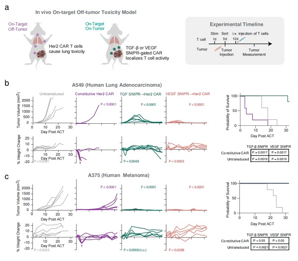 体外实验表明,只有在TGF-β和VEGF存在的情况下,SNIPR才会启动CAR-T细胞的抗肿瘤活性,因此,这些CAR-T不会在不受癌症影响的身体区域启动免疫应答,从而减少非肿瘤靶向毒性(On-Target Off-Tumor)。