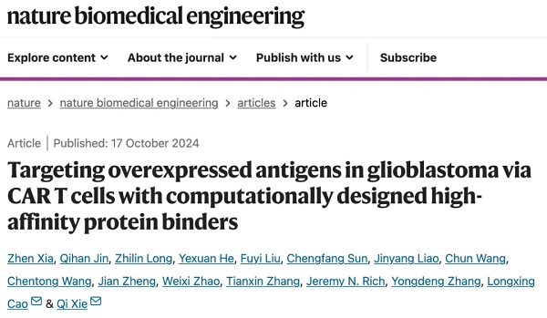 2024年10月17日,西湖大学生命科学学院谢琦、曹龙兴团队(夏真、金启涵为共同第一作者)在 Nature 子刊 Nature Biomedical Engineering 上发表了题为:Targeting overexpressed antigens in glioblastoma via CAR T cells with computationally designed high-affinity protein binders 的研究论文【3】。