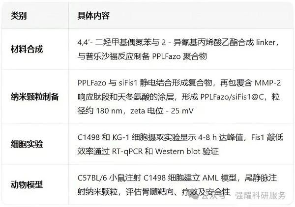 (3)双响应肽涂层实现骨髓靶向;建立AML小鼠模型验证体内疗效。