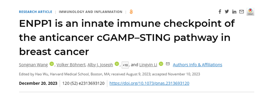 12月20日,斯坦福大学Lingyin Li副教授团队在《美国国家科学院院刊》上发表了相关研究,论文题目为:ENPP1 is an innate immune checkpoint of the anticancer cGAMP–STING pathway in breast cancer。研究发现ENPP1是一个开关,控制着乳腺癌抵抗免疫治疗和转移的能力。它是由癌细胞和肿瘤内外的健康细胞产生的,而高患者ENPP1水平与免疫治疗耐药性和随后的转移有关。