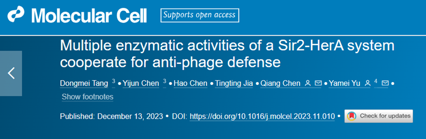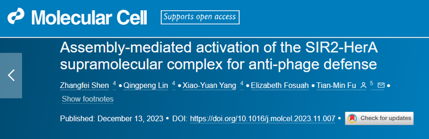 12月13日,来自美国俄亥俄州立大学医学院生化与药理学系傅天民团队在Molecular Cell 杂志上发表了关于SIR2-HerA的研究,其题目为Assembly-mediated activation of the SIR2-HerA supramolecular complex for anti-phage defense。研究分析了SIR2、HerA和SIR2-HerA复合物的分子结构,并用生物化学手段阐释了该系统多元的酶活性,包括核酸酶,ATP水解酶,DNA解旋酶,以及NAD(P)+水解酶,这些不同的酶活功能协同作战,高效反击了噬菌体感染。该研究揭示了SIR2-HerA的超分子组装是一种独特的转换酶活性和加强抗噬菌体防御策略。