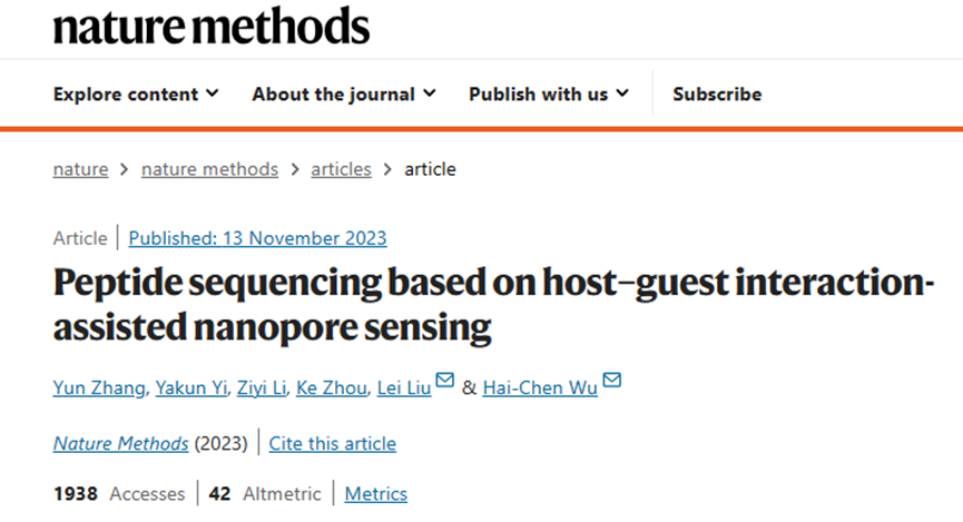 11月13日,中国科学院化学研究所吴海臣研究员和高能物理研究所刘蕾副研究员等在Nature Methods期刊发表了题为:Peptide sequencing based on host–guest interaction-assisted nanopore sensing的研究论文。该研究发现,N端为苯丙氨酸的多肽与胍环分子结合后,多肽穿过α-溶血素纳米孔的阻滞时间增加,使其对特定位点的氨基酸具有极高的分辨率,可对20种氨基酸进行有效区分。在此基础上,研究者通过使用羧肽酶切割目标多肽中的氨基酸,偶联到多肽探针上,成功实现了基于纳米孔技术的多肽序列测定。