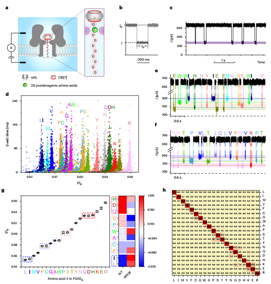 他们将20种氨基酸通过偶联反应分别连接到N端为苯丙氨酸、C端为8个天冬氨酸的FGGCD8多肽探针上,并通过WT α-溶血素纳米孔进行分析。虽然偶联后αHL纳米孔对20种氨基酸的分辨率略有下降,但通过利用不同的突变蛋白纳米孔,依然对全部20种氨基酸实现了有效的区分。