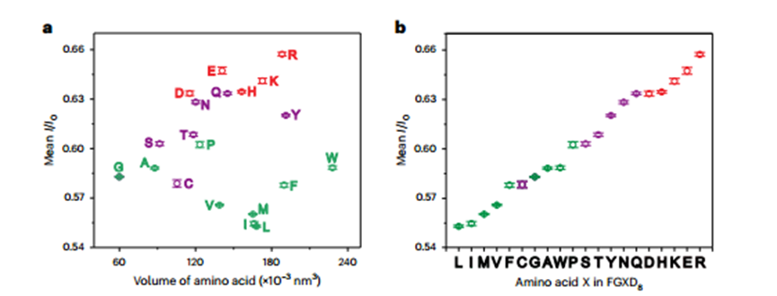 4)接下来,研究者对FGXD8多肽成功区分氨基酸X的机制进行了深入研究。通过对比发现,电流阻滞与氨基酸的体积之间没有相关性,而与氨基酸的极性之间存在显著的相关性。