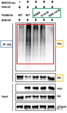从图中可以看出,在第二个泳道的的泛素化水平最明显,说明PGAM5自身可以发生泛素化。同时,通过构建不同的泛素化突变类型(K88R, K141R, K88~141R)来观察PGAM5泛素化水平的变化,可以发现,在第四泳道所指示的K88~141R突变体下,PGAM5的泛素化水平受到了明显的抑制,说明PGAM5的泛素化主要发生在其88和141位点的赖氨酸上。通过不同的分组,比较哪一个位点的泛素化会更重要,其结合强度代表着PGAM5的泛素化程度。