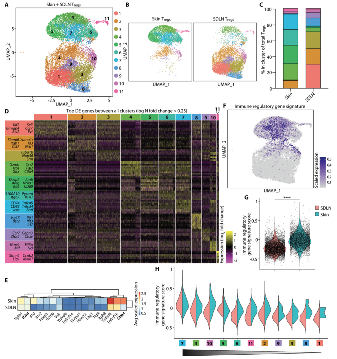 图1. 皮肤调节性T细胞表现出升高的免疫调控基因特征