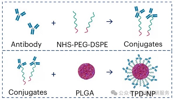 研究人员设计并合成了抗体或肽修饰的纳米颗粒(TPD-NPs),利用聚乙二醇-二硬脂酰基磷脂酰乙醇胺(PEG-DSPE)作为连接剂。通过自组装方法制备了PLGA核心的聚合物-脂质杂化纳米颗粒,并在其表面修饰抗体或肽。