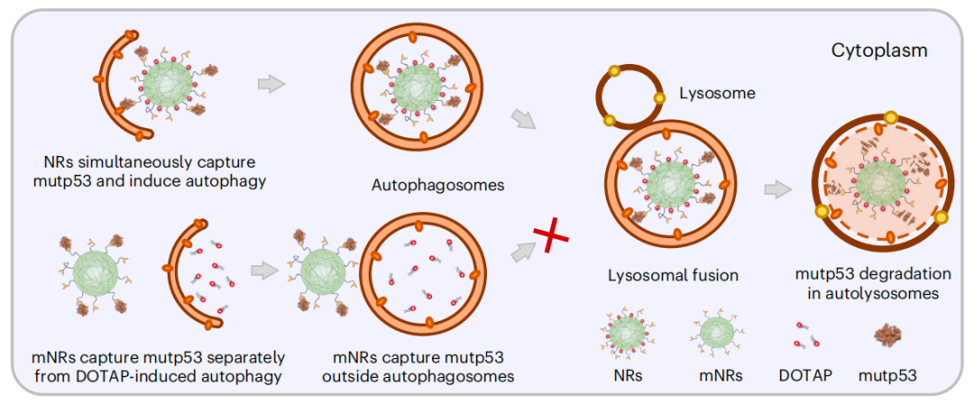 一方面,纳米受体(NR)表面的mutp53结合肽(MBP)靶向并结合到mutp53。另一方面,阳离子脂质DOTAP通过诱导自噬体形成增加来提高自噬水平,并协助将纳米受体结合的mutp53带入自噬小体。这些纳米受体在体外和患者来源的异种移植(PDX)卵巢癌模型中得到证实。