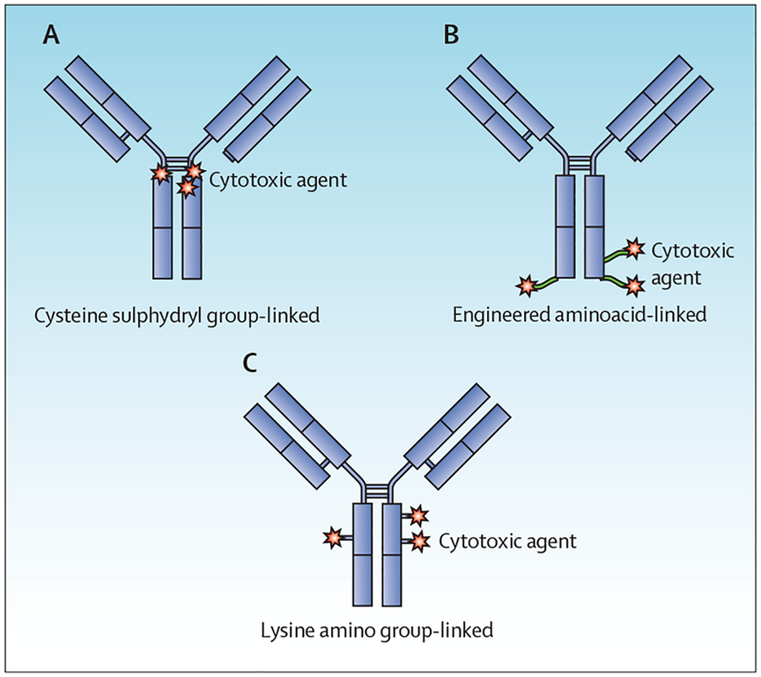 图5. ADC中连接药物的方法,doi: 10.1016/S1470-2045(16)30030-4
