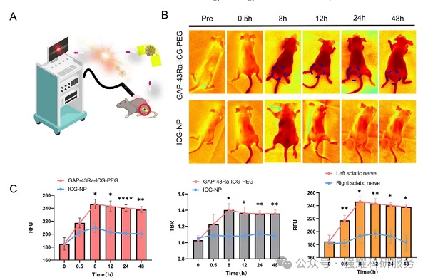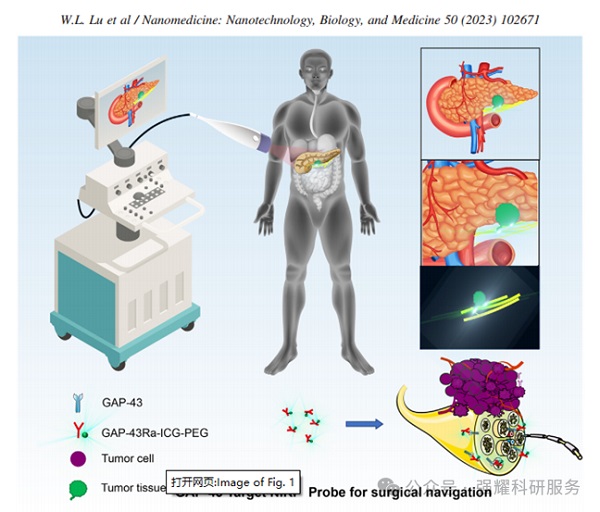 基于此,南方医科大学珠江医院范应方教授团队,以GAP-43作为靶点,高度特异性结合肽抗体来修饰ICG,制备一种用于PNI术中成像的近红外荧光(NIRF)探针。同时用聚乙二醇修饰形成脂质体以增加其亲水性和稳定性。该探针在临床前模型中有效地可视化了胰腺癌中的PNI病变,为NIRF引导的胰腺手术开辟了新的可能性,特别是对于PNI患者。