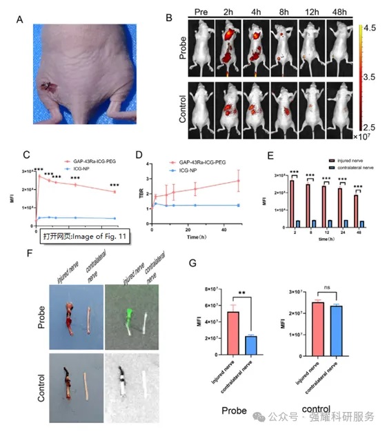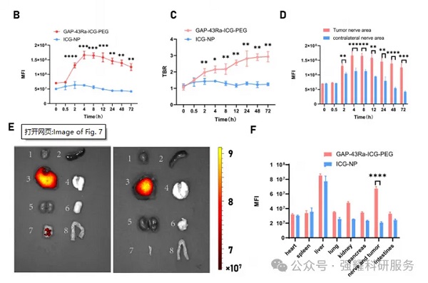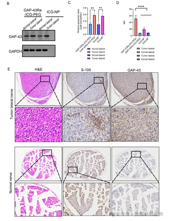 研究人员构建神经损伤模型,以证明GAP-43Ra-ICG-PEG探针集中在肿瘤侵袭的神经中,而不是肿瘤本身。结果显示,随着时间的延长,在注射探针后的每个时间点,损伤神经的荧光信号显著高于对照探针组和正常神经组。排除干扰因素后,受损神经和正常神经的荧光比较显示,受损神经特异性摄取GAP43Ra-ICG-PEG探针。值得注意的是,IHC结果证实GAP-43在受损神经中高度表达。