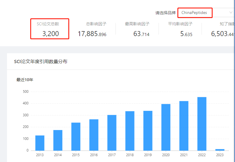 According to incomplete statistics, as of December 31, 2022, more than 3200 SCI papers have quoted the services and products of ChinaPeptides. The services and products of ChinaPeptides cited in the literature are mainly peptide synthesis and customization, with a total impact factor of 17,885.896 and an average impact factor of 5.635. In 2022 alone, ChinaPeptides-assisted the publication of 455 SCI literatures, the number of literatures in a single year increased for 10 consecutive years, again reaching a record high.