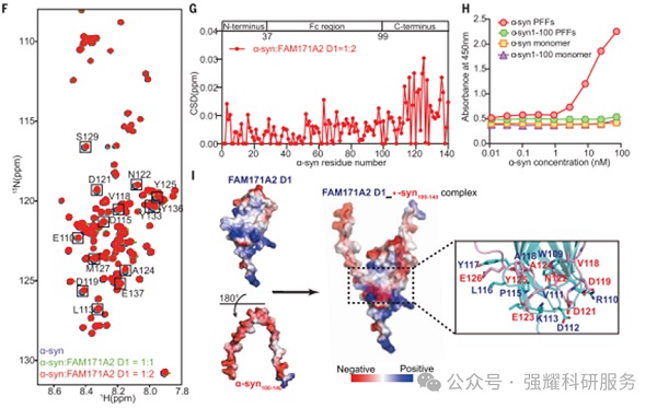通过细胞实验的免疫荧光和Western blot验证FAM171A2对α-syn纤维内吞的调控作用,并且验证了FAM171A2 与 α-突触核蛋白 (α-syn) 纤维直接相互作用和具体位点。