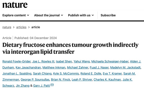 2024年12月4日,圣路易斯华盛顿大学的研究人员在国际顶尖学术期刊 Nature 上发表了题为:Dietary fructose enhances tumour growth indirectly via interorgan lipid transfer 的研究论文。