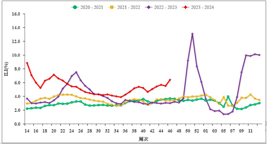 2020-2024 年度南方省份哨点医院报告的流感样病例%