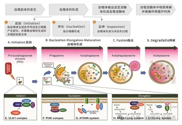自噬的起始→ 隔离膜和自噬体的形成→ 自噬体与溶酶体融合→ 自噬体的裂解