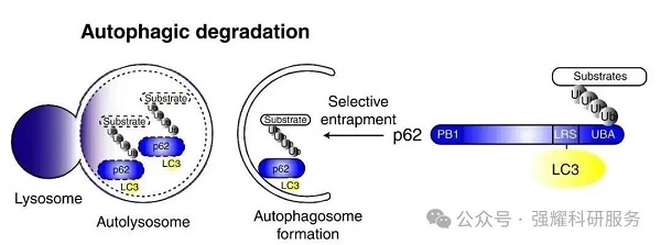 p62是自噬的关键选择性底物。在自噬过程中,p62通过桥接LC3与泛素化蛋白,被共同包裹进入自噬体,并最终在自噬溶酶体中降解。因此,p62蛋白的表达水平与自噬活性呈负相关,通过Western Blot检测其表达量已成为评价自噬水平的常用方法。
