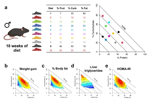 实验过程中,研究者将雄性小鼠分成10个组别,每组分别投喂热量相同、但宏量营养素比例各异的食物,例如蛋白质含量在10%-50%之间变动,脂肪占比10%-60%,碳水化合物占比30%-70%。在历经13周的特定饮食后,这些雄性小鼠与一直保持常规饲料饮食的雌性小鼠进行交配。而后研究人员对其雌性后代进行了全面细致的表型特征分析。