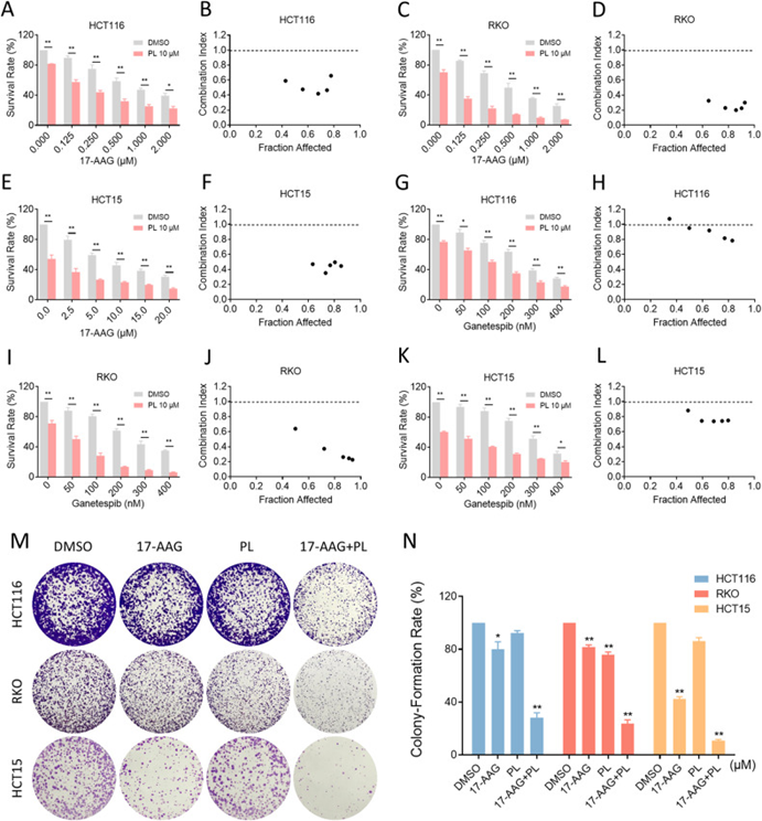 HSP90抑制剂17-AAG和ganetespib以剂量依赖性方式降低结肠癌细胞的活力。当HSP90抑制剂与PL联合使用时,生长抑制作用更为明显;进一步分析表明HSP90抑制剂与PL有协同作用(17-AAG与PL的协同作用优于ganetespib);进一步评估了17-AAG与PL联合对结肠癌细胞集落形成能力的影响,结果如图1所示,17-AAG与PL联合使用导致菌落数量显著下降。