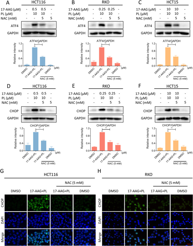 特定抑制剂对HSP90的抑制会引发各种癌细胞中的内质网(ER)应激。研究显示,联合治疗后结肠癌细胞中GRP78、ATF4和CHOP的表达增加,其中后两种表达增加显著;CHOP积累集中在细胞核中,使用慢病毒系统敲低了CHOP表达,结果发现显著逆转了17-AAG和PL在细胞生长抑制方面的协同作用,表明CHOP对于协同作用至关重要。