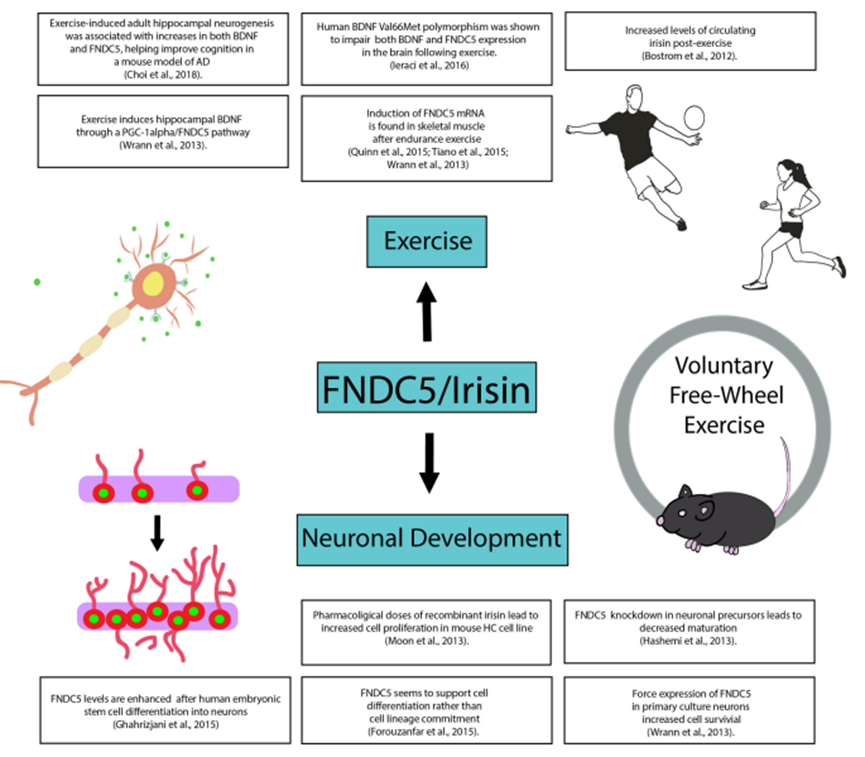 FNDC5/鸢尾素作为一种能够改善认知、学习和记忆功能的新型治疗因子,已在脑缺血、中风和焦虑引起的脑损伤中得到证实。RNA干扰(RNAi)介导的FNDC5敲低可减少脑源性神经营养因子(BDNF)。而用腺病毒传递FNDC5来增加血液中的鸢尾素水平,会增加BDNF和其他神经保护因子的表达。FNDC5 KO小鼠齿状回神经元(海马的一部分)形态和功能异常,突变小鼠的认知功能明显受到抑制。AD模型中,海马和脑脊液中FNDC5/鸢尾素表达降低。抑制大脑中的FNDC5会损害小鼠的记忆系统,并阻断体育锻炼对突触可塑性和记忆的神经保护作用。相反,AD小鼠中鸢尾素水平的增加改善了突触可塑性和记忆力。
