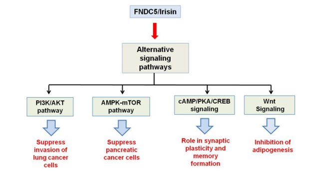 FNDC5/鸢尾素通过MAP激酶信号传导以外的途径进行生理活动的示意图,doi: 10.3390/molecules27031118