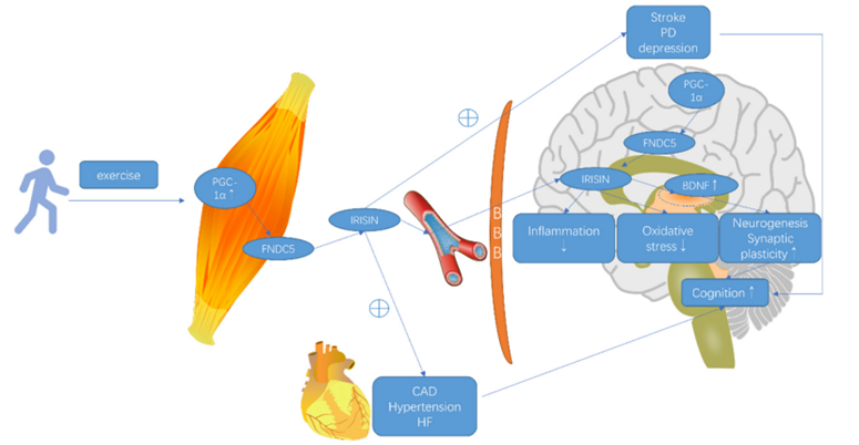 鸢尾素是一种由运动诱导的肌因子,以希腊神话中彩虹女神Iris命名。它源自前体蛋白纤连蛋白III型结构域含蛋白5(FNDC5)。运动时肌肉收缩使得过氧化物酶体增殖物激活受体PGC-1α的表达增加,导致FNDC5蛋白的产生,在血液中裂解为鸢尾素。FNDC5/鸢尾素具有预防和治疗各种不同的慢性疾病,包括肥胖、2型糖尿病、骨代谢、心血管疾病和神经退行性疾病等。