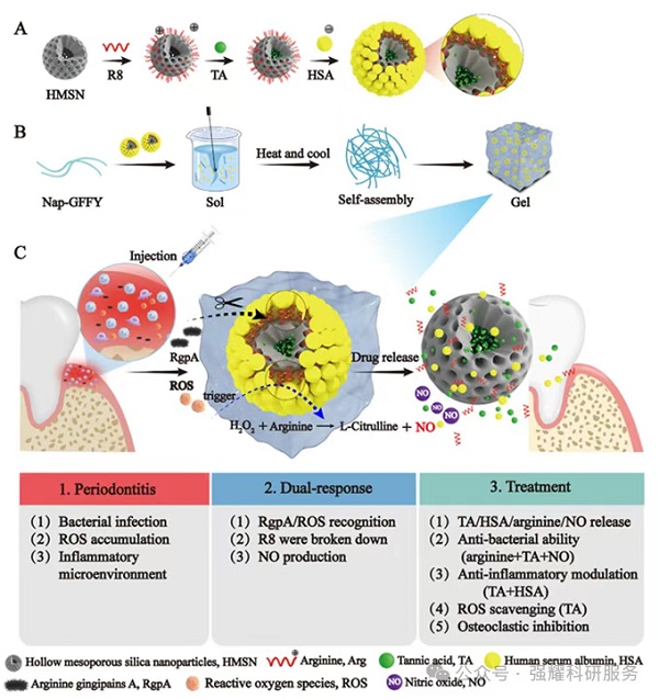 NHRT水凝胶由两部分组成:负载单宁酸(TA)并功能化多聚精氨酸(R8)的中空介孔二氧化硅纳米颗粒(HMSNs-R8@TA-HSA),以及Nap-Gly-Phe-Phe-Tyr-OH(NapGFFY)超分子水凝胶。其中,R8作为连接基团,能够与RgpA和ROS相互作用。RgpA是牙周病原菌(如Pg和Aa)分泌的关键酶,而ROS则是炎症反应的重要标志物。通过检测这两种物质的浓度变化,NHRT水凝胶可以实现药物的智能释放。