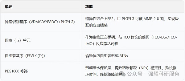 2、肿瘤微环境中的 MMP-2 切割 TMP 的 PLGYLG 序列,释放 TzP 片段;③TzP 与癌细胞表面 HER2 结合,自组装形成 ATNs,暴露 Tz 位点;