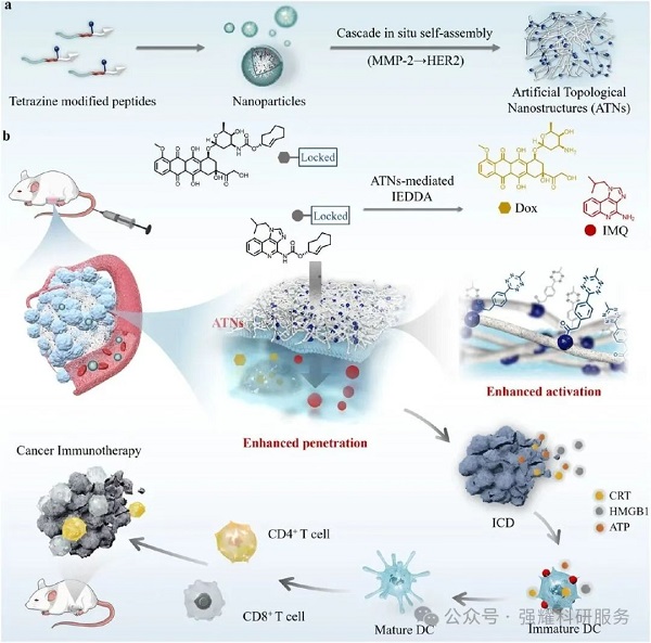 Fig1. 自组装人工拓扑纳米结构(ATNs)增强癌症免疫治疗中生物正交前药激活与药物穿透的机制示意图