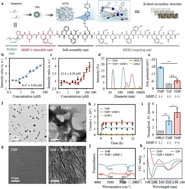(2)形态与结构:MMP-2 处理后,TMP NPs 从 91.3 nm 转变为 712 nm 的纳米纤维(ATNs)。TMP 可通过 MMP-2 介导的水解触发疏水相互作用与氢键形成,自组装为具有 β- 折叠结构的 ATNs(TEM/SEM/CD验证,图 2d-f/k);