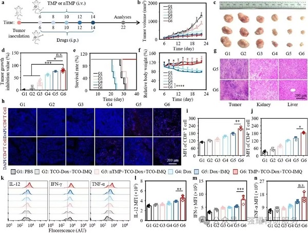 (2)抗肿瘤 efficacy:TMP+TCO-Dox+TCO-IMQ 组肿瘤抑制率超 70%,小鼠 30 天存活率 100%(游离 Dox 组全部死亡,图 6d-e);