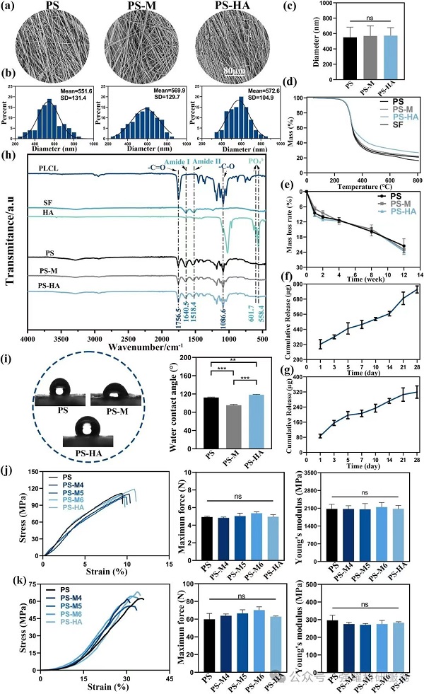将MDP1和HA分别掺入PLCL和SF中,并使用SEM观察形貌、TGA分析热稳定性、FTIR验证成分、水接触角测试亲水性、Instron 测定力学性能(支架 Young’s 模量约 278.59 MPa,接近天然肌腱)。