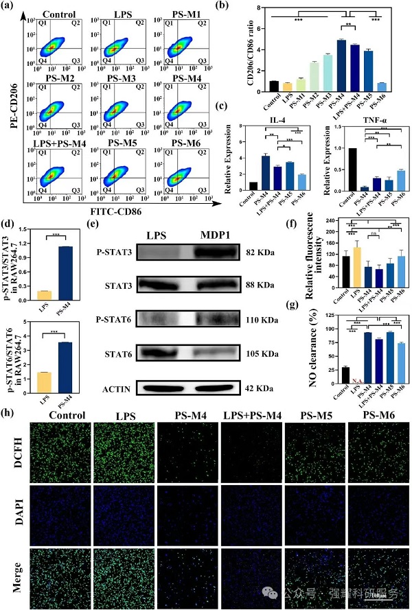 b. 氧化应激抑制:PS-M4组ROS水平最低,NO清除率达70%,显著降低炎症微环境中的氧化损伤。