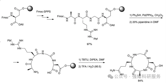 树脂上环化具有固相合成的优点,可简单地在玻璃容器中进行,避免了溶解性问题,减少了寡聚副产物生成。然而,该方法需要一个氨基酸(如Asp、Glu、His等)的侧链可以连接到固相载体上。为了完成头尾环化反应,还需要采用三维正交保护策略。