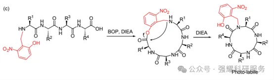该环化技术是通过将光敏性的辅助分子2-羟基-6-硝基苯甲醛(HnB)引入至肽链的N端,经过缩合反应形成16元环脱脂肽。通过O-to-N的酰基迁移获得N-取代环四肽。最终,利用光解反应移除HnB基团。