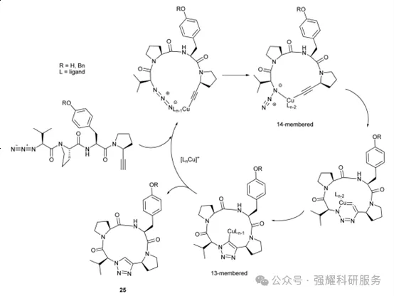 三唑肽是强效酪氨酸酶抑制剂cyclo(L-Pro-L-Val-L-Pro-L-Tyr)的一种含三唑类似物,其合成一直难以实现。通过Cu(I)催化的点击环化反应,成功地引入了一个1,4-二取代的1,2,3-三唑作为反式酰胺键的替代物,高效地制备了这种三唑肽(产率为70%)。