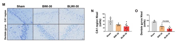 额叶TTC染色显示,BLWI-30组的脑梗死亡率高于BLWI-30组,而BLWI-30组额叶、枕叶和海马CA1区域的组织损伤程度也高于BWI-30组。因此,正如预期的那样,BLWI-30组的大脑平均组织损伤评分(额叶、顶叶、颞叶、枕叶和海马体)远高于BWI-30组。这些结果表明,同时发生肝缺血会加剧脑缺血的再灌注损伤。