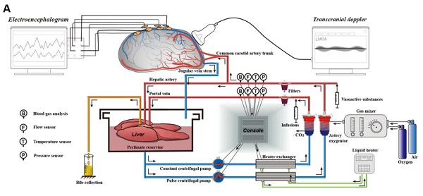 具体来说,该研究在猪模型中观察到,与没有肝缺血的再灌注大脑相比,同时存在肝缺血的大脑的额叶梗死面积更大,脑组织损伤评分升高,血管内CD45+细胞粘附增加。在团队自主开发的离体大脑常温机械灌注(NMP)模型中,证明了在大脑NMP回路中增加功能性肝脏,可显著减少心脏骤停后的脑损伤、增加神经元活力并改善皮层电活动,此外,在存在或不存在肝缺血的情况下,转录组和代谢组均观察到显著改变。